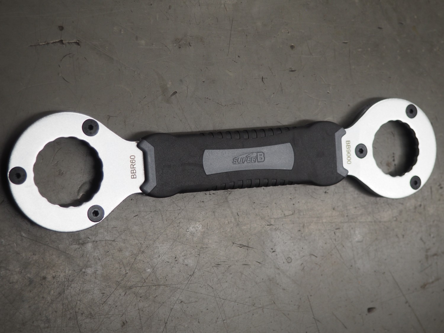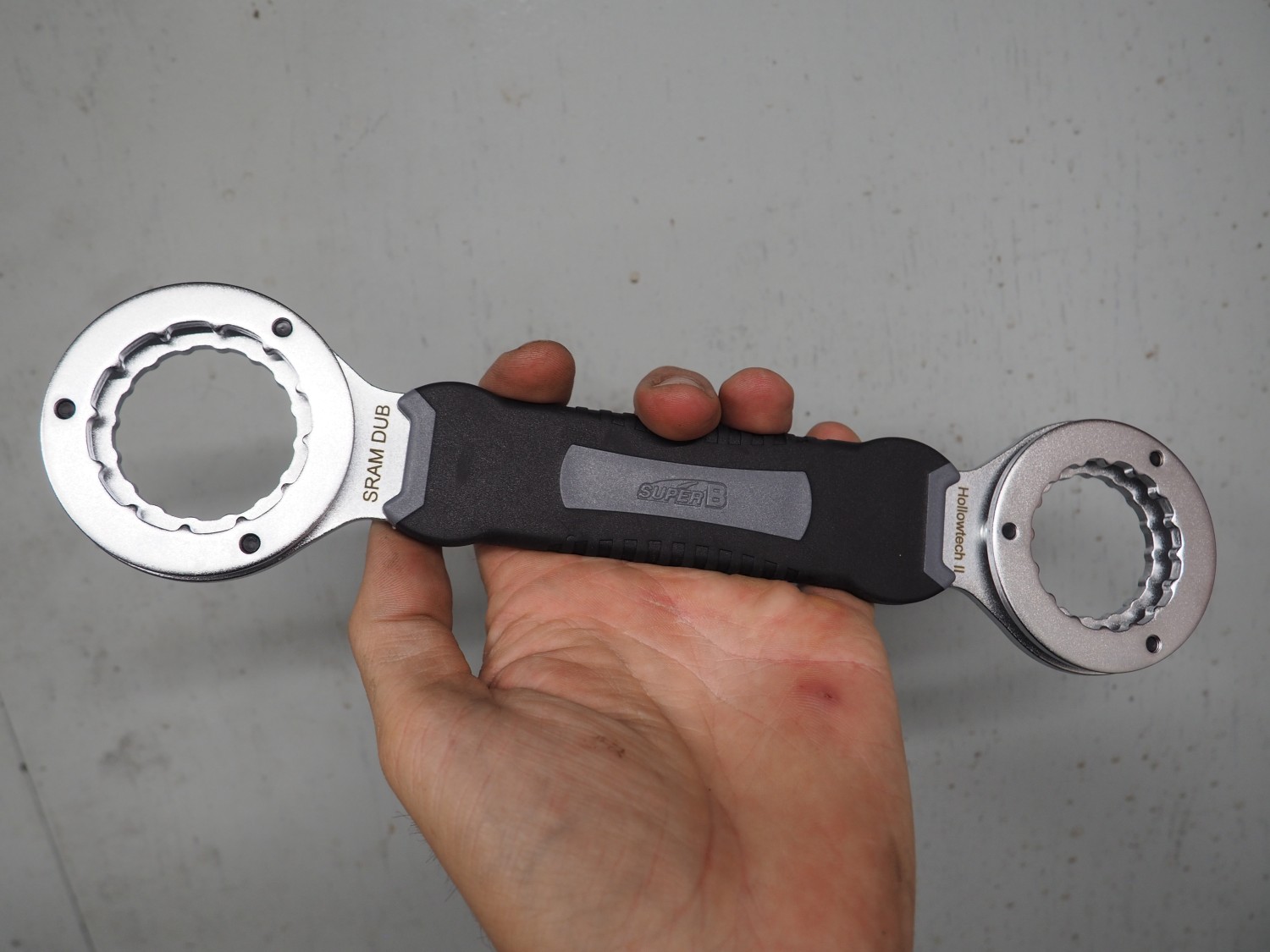 Nebo nemusíte, pokud vozíte PressFit, ale když máte závit, tak stačí jeden na Hollowtech II a do něho plastové redukce na BBR60 či BB9000, plus jeden na DUB. Plastové redukce mám, ale je to občas otrava, instalovat je a zase vyjmout ven, sedí docela těsně. Sram DUB jsem si pořídil přímo na ráčnu, ale teď jsem vyzkoušel jeden společný klíč pro všechny čtyři standardy. SuperB TB-BB42 totiž kombinuje hned čtyři typy drážkování na jednom klíči. Ten má chrom-molybdenové základní tělo s měkčenou plastovou rukojetí a na každém konci jeden typ drážkování. K němu je ovšem přes trojici šroubů s podložkami upevněn druhý typ drážkované hlavice, která je částečně odsazená. Díky odsazení lze jednoduše nasunout i větší hlavici dostatečně hluboko na středové misky, než se zapře o menší průměr základní nosné hlavice na rukojeti. Jednoduché a hlavně plně funkční, navíc snadno použitelné díky dobře čitelným označením každé ze čtyř hlavic. Délka nástroje je v maximu třicet centimetrů, takže páka na každou z hlavic je o něco menší než u některých samostatných kousků s delší rukojetí, ale i tak je to víc než dostatečný záběr. Manipulace s nástrojem je opravdu jednoduchá a dotahovali jsme jak DUB střed, tak matici brzdového kotouče Centerlock, obojí naprosto ideální řešení. Ať už děláte některý ze čtyř standardů, nebo montujete brzdy, sáhnete na stěnu pro jeden klíč a máte vyřešeno. Při cestě někam do bikeparku nebalíte čtyři klíče, ale jeden. Za 676 korun tedy velice praktické řešení a v podstatě nebylo nutné po čase ani dotahovat jisticí šrouby spojů, drží to.