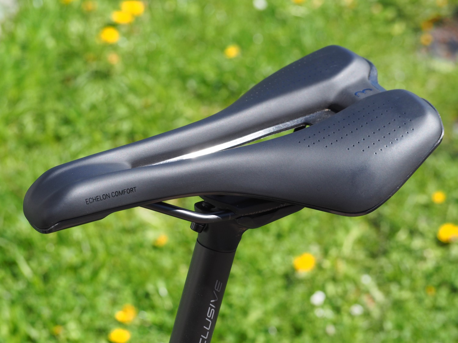 Holandská značka BBB přitom model Echelon nabízí ve více variantách, tedy klasický sportovně závodní Echelon, pak pohodlnější Echelon Comfort a nejnověji také zkrácený závodní Echelon Pro. Pod redakčním pozadím je aktuálně na gravelu komfortnější verze, tedy Echelon Comfort, konkrétně v prostřední nabízené šířce 155 milimetrů (145 + 165 mm), tedy s označením BSD-157 a cenou 1649 korun. Sedlo dlouhé 265 milimetrů má Cr-Mo ližiny a skořepinu vyztuženou skelnými vlákny, takže nehoní gramy za každou cenu a jde spíše naproti rozumné ceně. I tak je ale hmotnost 300 gramů celkem přijatelná, zvlášť když přihlédneme k rozměrům sedla a výšce polstrování. Sedlo se syntetickým potahem patří mezi ta, která to se středovým kanálkem či otvorem myslí opravdu vážně a tady je v opravdu velkorysém provedení. Kanálek začíná už od poměrně komfortně polstrované špičky s možností sezení v prudších výjezdech a mění se ve velký otvor s jasně ohraničeným okrajem skořepiny i polstrování. To je v přední a středové partii sedla opravdu vyšší s užším střihem, takže jsou oba boční profily kolem otvoru cítit za jízdy v rozkroku a vše mizí až směrem dozadu, kde se sedací plocha rozšiřuje a tlak rozkládá na větší plochu. Vysoká hustší PU pěna má třetí stupeň tuhosti z devíti možných, přičemž čím vyšší číslo, tím měkčí pěna a méně sportovnější určení. Tlumí slušně, ale není zbytečně poddajná, takže boční „hrany“ se sice poddají, ale pokud sedíte víc vpředu, jsou v závislosti na tuhosti antibakteriální výstelky lehce cítit. V jedněch kalhotách jsem přemýšlel, zda není ohraničení středového otvoru přece jen zbytečně výrazné a neměl bych mít užší sedlo, v dalších jsem pak o profilaci sedla skoro nevěděl. V obou případech byl ale společným znakem nulový tlak na citlivé partie, tady opravdu nemá co tlačit a delší hodiny v sedle tak nevyvolají necitlivost „tam dole“. Sedlo je díky středovému prohnutí a zvednuté zadní partii určené pro sportovnější 45° posed a musím potvrdit, že hodně záleží na pozici jezdce na sedle. Sezení více vzadu je komfortní, dobře rozkládá tlak na sedací kosti a současně ohraničení středového otvoru není skoro znatelné. Jakmile ale sedíte více na středu, logicky jsou vystouplé profily kolem otvoru více znát. Špička ale není ani při širším rozsahu sklonu sedla nějak výrazně cítit, byť působí širším dojmem.