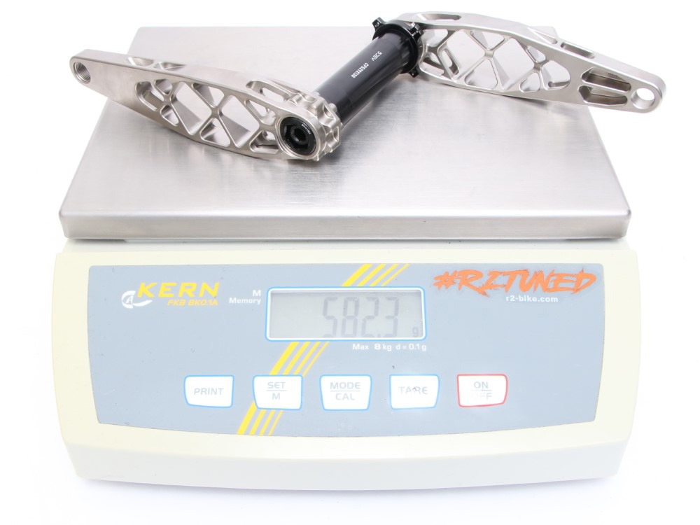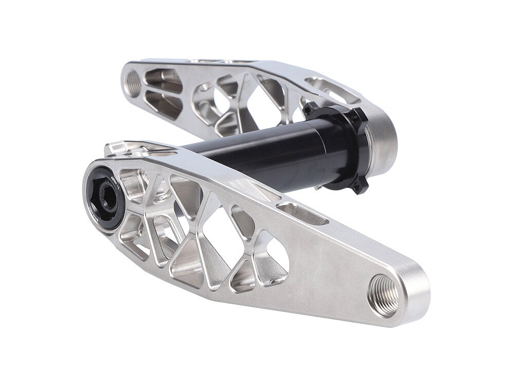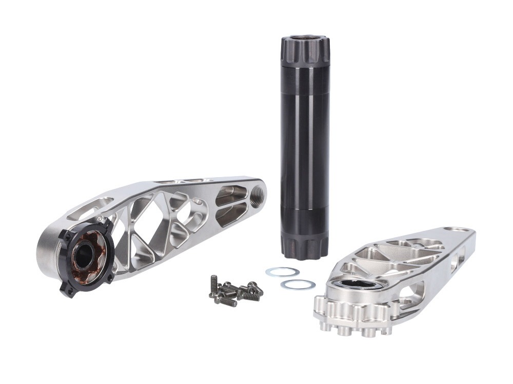 Tyhle kliky 5DEV Titanium Cranks stojí 1250 Eur, tedy něco kolem třiceti tisíc korun, což je opravdu raketa, ale jelikož titan odolá i korozi a je to houževnatý a současně lehký materiál, jedná se opravdu o technický skvost. Kliky mají až extrémně odlehčená ramena a každé z nich je na vícehranu osy uchyceno samostatně, což řeší samostahovací šrouby pro jednodušší demontáž. Převodník sází na osmičku upevňovacích šroubů standardu Sram, takže si lze vybrat zda klasiku nebo už provedení s wattmetrem. Do rámu je počítáno s osou DUB nebo 30 mm, dodávanou dle standardů středových složení ve třech různých délkách. To znamená Q-Faktor 168mm (Boost), 177mm (SuperBoost) a 183mm (DH standard). Pro vymezení vůle pak slouží hliníkový předpínací kroužek, tedy žádný plast. Předpínací kroužek je samozřejmě z dostupnějšího materiálu, tedy slitiny AL 6061, zatímco samostahovací šrouby spoléhají na Al 7075. Bez převodníku pak 165 nebo 172,5 mm dlouhé kliky váží v závislosti na použité ose 553 g (Boost), 564 g (SuperBoost) a 583 g (DH standard).