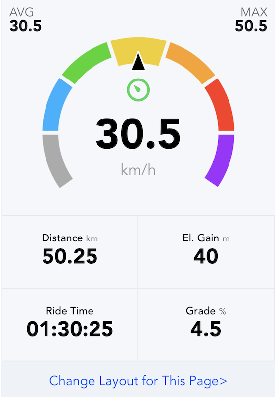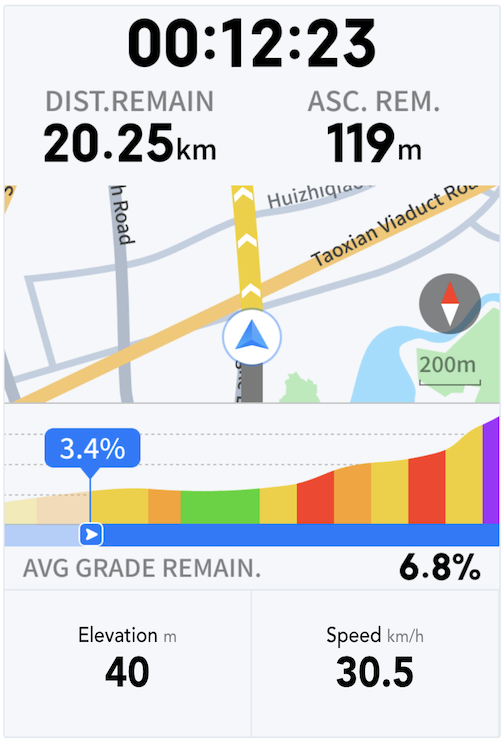 Po přepnutí do stavu sledování jízdy se computer přepne na obrazovky, mezi kterými můžete listovat. Buď tlačítkem nebo prstem. Nejdříve to je klasický tachometr s rychlostí, vzdáleností atd., další je mapa, následují další datová obrazovky s nejrůznějšími údaji o vaší jízdě. Máte o všem dokonalý přehled.