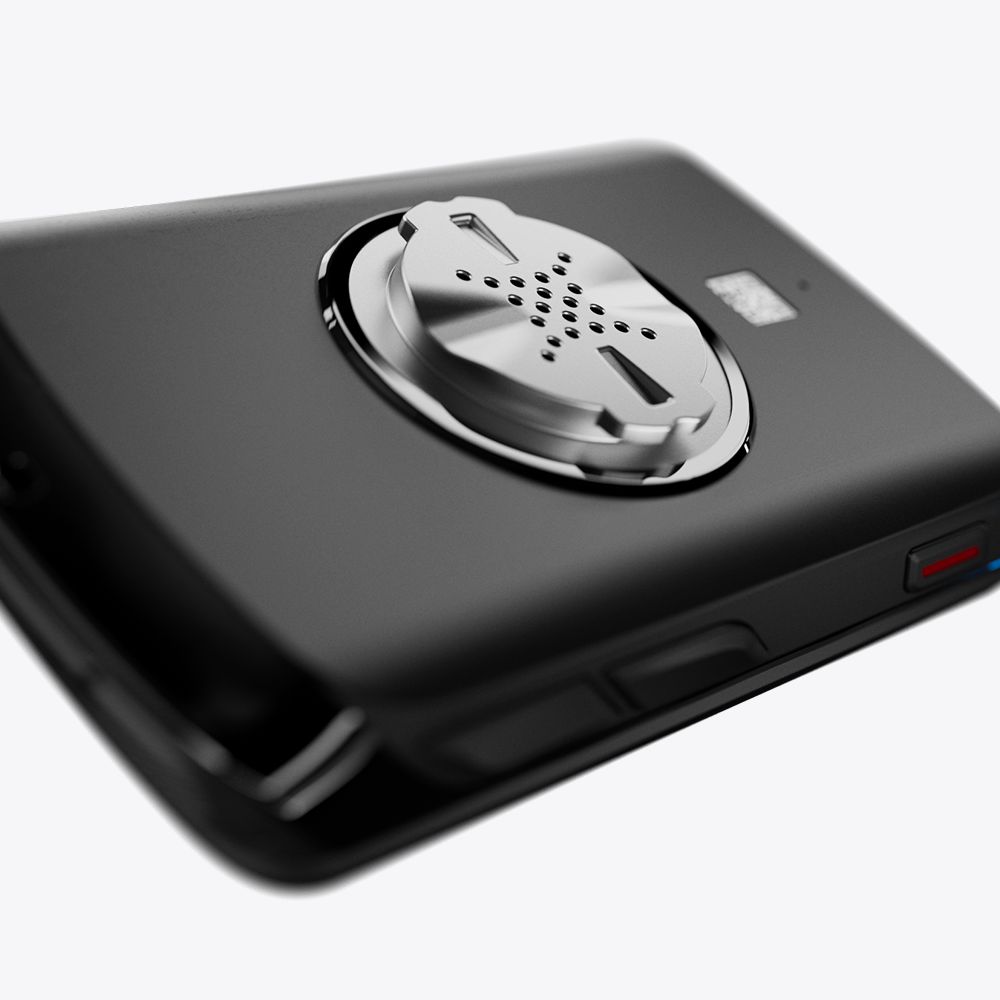 Najdeme na něm pět ovládacích tlačítek. Ale samozřejmě že ovládání je i dotykové. Mně osobně jsou tlačítka přirozenější. Přístroj má velikost 100 x 58 mm a displej velikost 46 x 68 mm. Tradičně a schválně uvádím zcela netradiční rozměr displeje v milimetrech a ne uhlopříčku. Protože se mi to zdá obecně srozumitelnější. Na první pohled vás také upoutá, že upínací mechanizmus na zadní straně přístroje je vyroben z lehkého kovu, a ne z tradičního plastu. Opět skvělá výjimka.