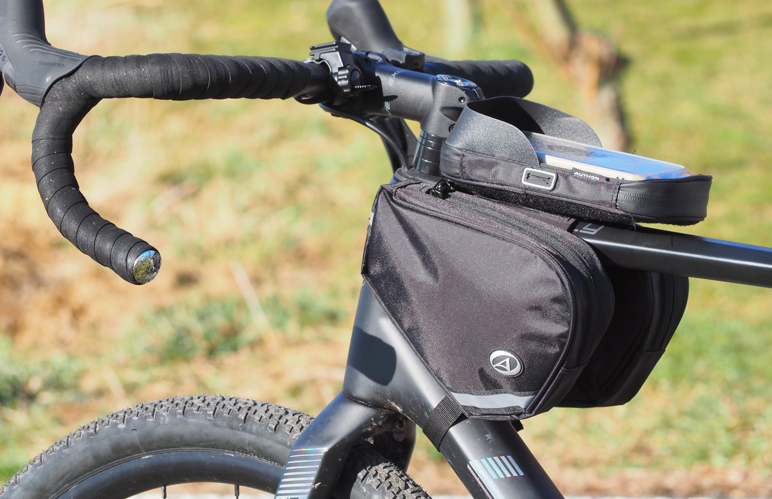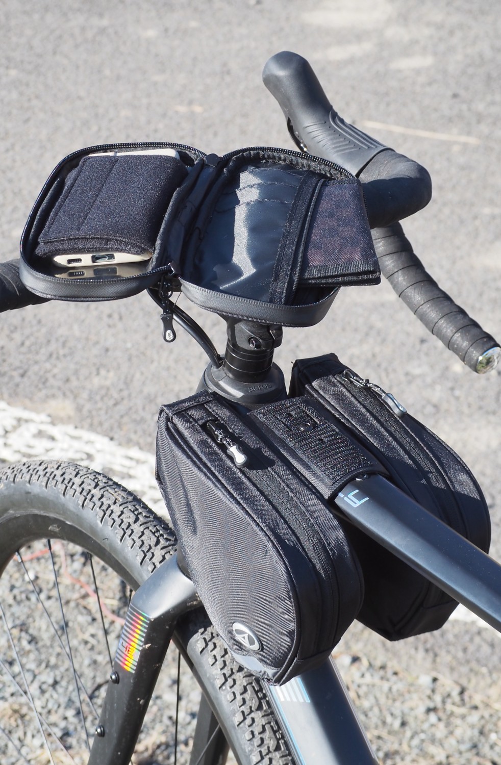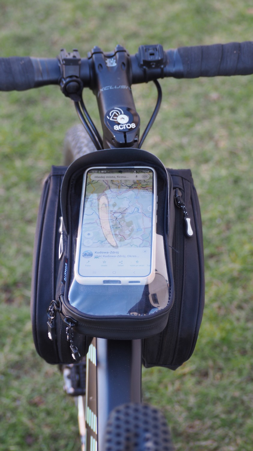 Přední dvojbrašna na horní trubku, doplněná odnímatelným horním pouzdrem na telefon a doklady, snadný přístup do obou bočních brašen a montáž stahovacími pásky nebo kombinací pásku a šroubu do závitové vložky, přítomné na většině současných gravelů. Takhle stručný popis ale nestačí, přece jen je tady těch vychytávek trochu víc. Brašna z nylonu 420D nepostrádá voděodolnou úpravu, vnější reflexní prvky a dvojice hlavních bočních brašen je spojena dílcem s pogumovanou spodní částí pro ochranu rámové trubky a navýšení adheze proti nechtěnému pohybu. Tenhle dílec má trojici otvorů pro zajištění šroubem do závitů na horní trubce, což byl i případ redakčního gravelu, ale pokud závity nejsou, nechybí odnímatelný stahovací pásek. Druhý pásek je pevně integrovaný do spodní hrany brašen a spojuje je navzájem pod spodní trubkou, takže nemají ani při jízdě ze sedla šanci hýbat se ven do stran. Uchycení za mě naprosto perfektně vyřešené a lze buď vozit jen samotné boční brašny, každou s objemem 0,6 litru, nebo využít i třetí díl. Tím je pouzdro na telefon a doklady, které se jednoduše upevní na suchý zip kryjící shora spojovací dílec brašen. Boční brašny s dlouhými horními zipy mají polstrování stěn a světlou vnitřní podšívku jednodílného prostoru pro lepší přehlednost, horní pouzdro je trochu propracovanější. Boční vodotěsný zip s dvojicí jezdců umožní jej plně rozevřít a pod horní folii umístit telefon jištěný dvěma polstry na suchý zip. Do spodní části lze do malých kapsiček dát doklady, platební a další karty a do kapsy na zip peníze, případně celou peněženku. Pokud jdete od kola, můžete tak díky suchému zipu jednoduše vzít celé pouzdro s telefonem, penězi a doklady s sebou. Nechybí boční výstup na nabíjecí kabel, pokud třeba chcete propojit za jízdy telefon s baterií elektrokola nebo powerbankou v boční brašně. Díky délce 185 a šířce 90 milimetrů zvládne tohle pouzdro opravdu velký telefon. Samsung S22 měl hodně velkou prostorovou rezervu. Výhodou je pak čelní štít, fungující jako stínítko, což se na kole někdy hodilo, ale jinak je ovládání displeje i bočních tlačítek telefonu naprosto jednoduché a plně funkční.