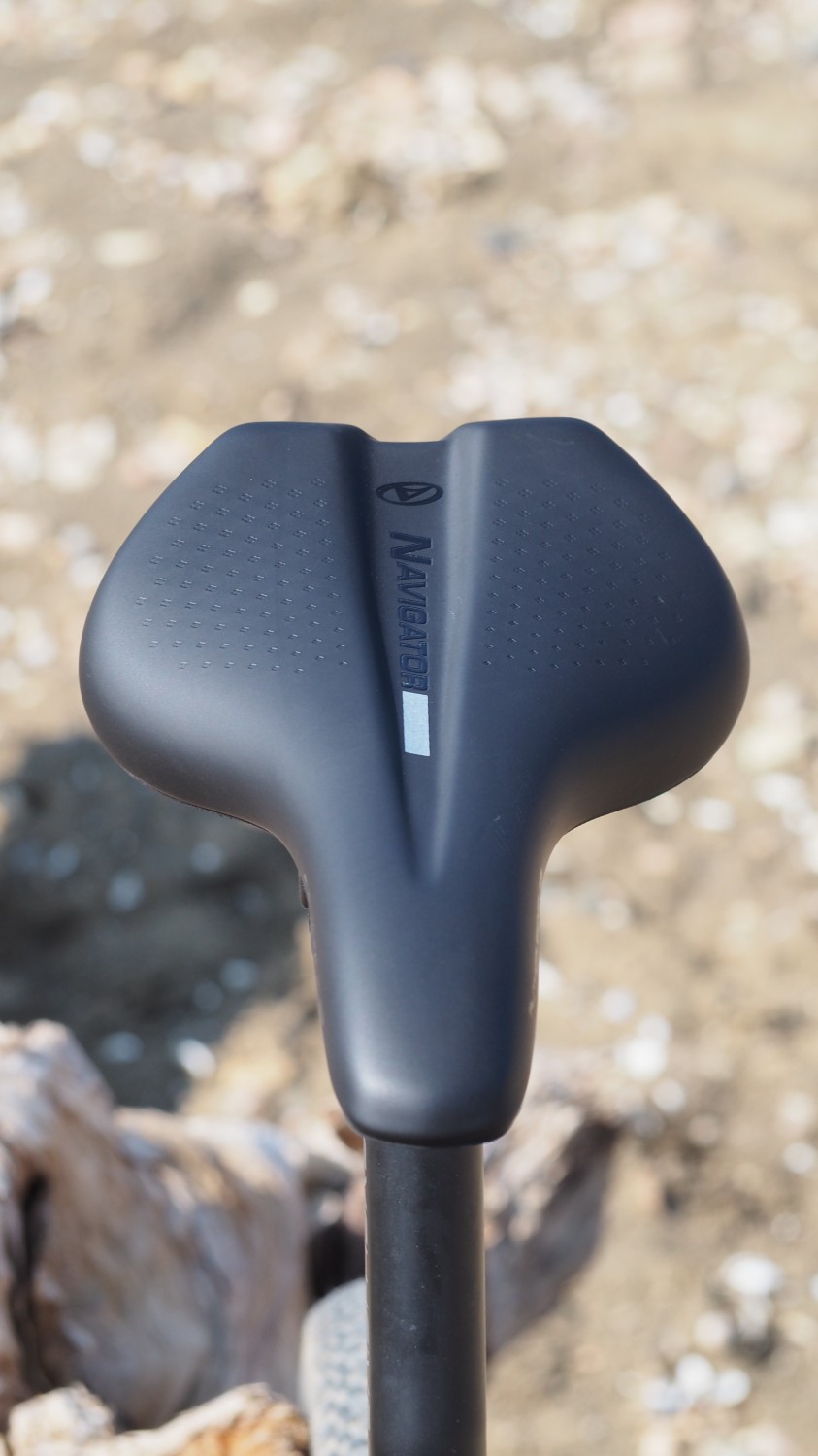 Navigator je sedlem se šířkou 160 milimetrů a délkou 270 milimetrů, takže žádný drobeček, ale ani velká „bačkora“. Přesto ale už na první pohled jasně určuje, že bude vhodnější pro větší rozestup sedacích kostí, čemuž moje XL pozadí (dle většiny kalhot) odpovídá. Sedlo má jednoduše provedenou skořepinu s podélným odlehčením pod horním středovým kanálkem, Cr-Mo ližiny a hladký syntetický potah. Ten tvoří jeden celek s pěnovou výplní. Širší zadní partie s nepatrně zvednutou koncovou částí přechází plynule do mírně dolů prohnuté středové části a střih zakončuje lehce zvednutý přechod do špičky. Všechny linie mají oblý hladký tvar, jen hrany středového kanálku jsou nepatrně výraznější, ale nejsou nějak znatelně cítit. Dodám jen hmotnost 364 gramů a cenu 695 korun.