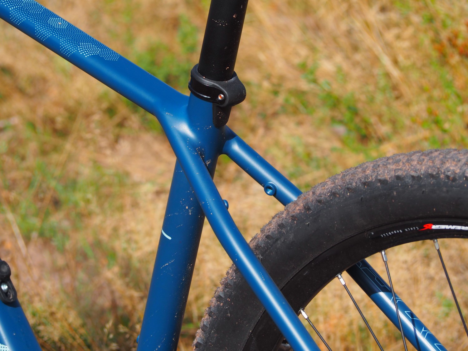 Občas méně znamená více a v případě rámu a jeho konstrukce to platí určitě, protože se zde zbytečně nehraje na všemožné profilace trubek a současné trendy, ale jde hlavně o praktičnost. Nižší konická hlavová trubka je samozřejmostí a na ni se napojuje zploštělá horní a naopak vyšší spodní trubka. Obě pojí delší svar, ale rám má tenhle uzel i ten v napojení na sedlovou trubku pečlivě vyhlazený a housenky jsou přiznané jen u zadních patek a středového pouzdra. Na něj se spodní trubka napojuje hezky zeširoka, má k tomu díky PressFit ložiskům dostatek místa, ale spodní hrana je otevřená, jelikož tudy vystupuje hadice zadní brzdy a řadicí bovden. Zajímavé je ovaření celého otvoru dokola, tedy žádná ostrá hrana, ale zpevňující svar. Sedlová trubka má lehké přední prohnutí pro lepší prostupnost zadního kola a nahrává tomu i absence horního a spodního spojovacího můstku. Dole jej supluje výztužný návarek spojený i se středovým pouzdrem, nahoře jsou zevnitř dva závity pro případnou montáž nosníku na blatník, případně ramen nosiče, protože patky dvojicí závitů počítají s obojím. Lze tedy rám osadit nosičem i blatníky, ale lépe mu rozhodně bude nalehko ve sportovnějším režimu. Pevná zadní osa boostové rozteče má shimanovské provedení upínáku, takže v tomto ohledu se na soudobé trendy myslelo a přední vidlice je rovněž na pevnou boostovou osu, ale už na imbusový klíč. Brzdový třmen sedí zevnitř zadní stavby, ale spoléhá na klasický PM úchyt, žádný FlatMount a kabeláž pak vstupuje do rámu na levé straně spodní trubky, takže plná integrace se nekoná.