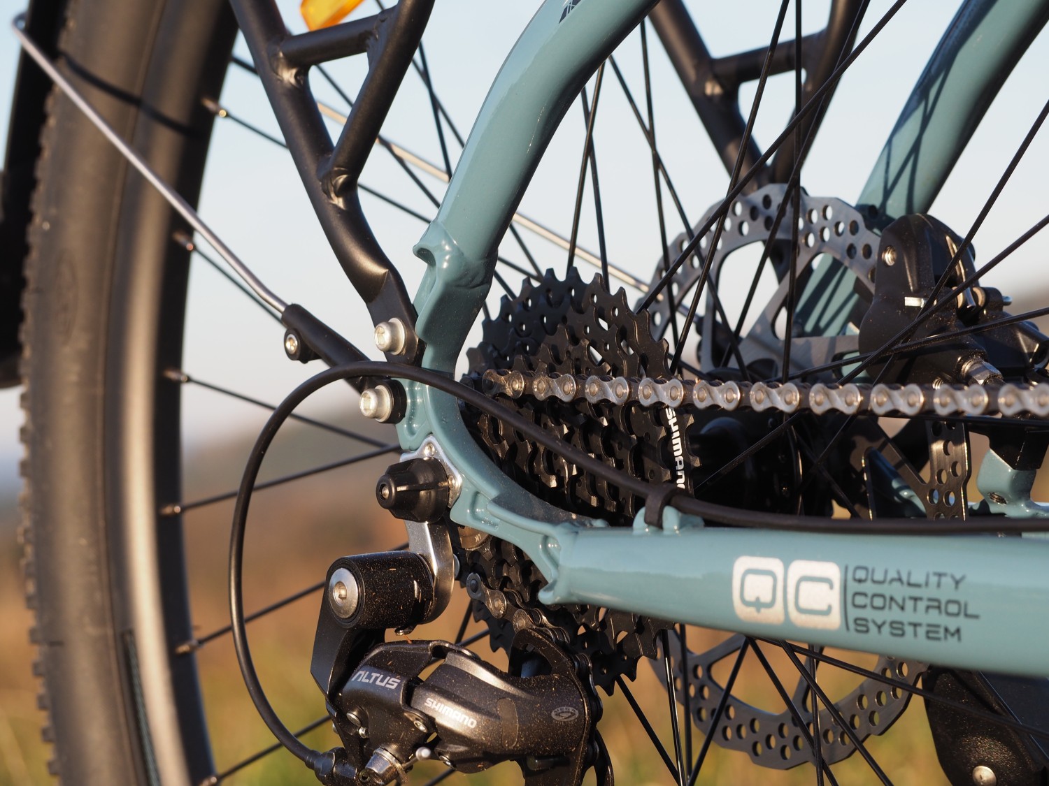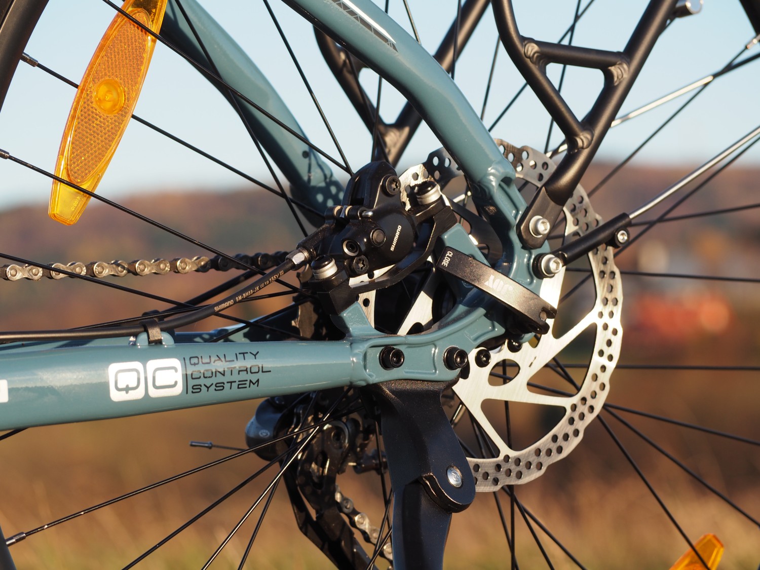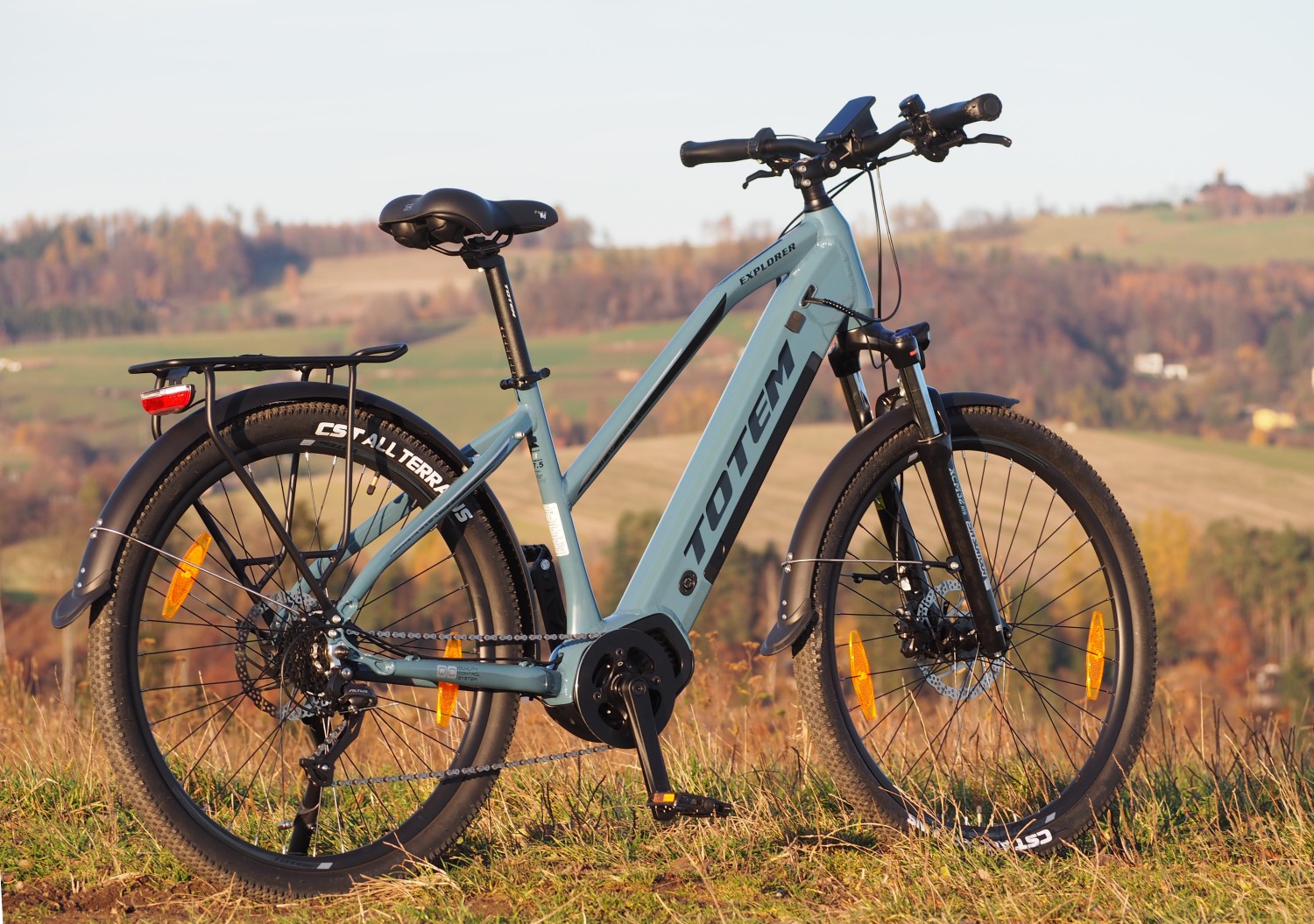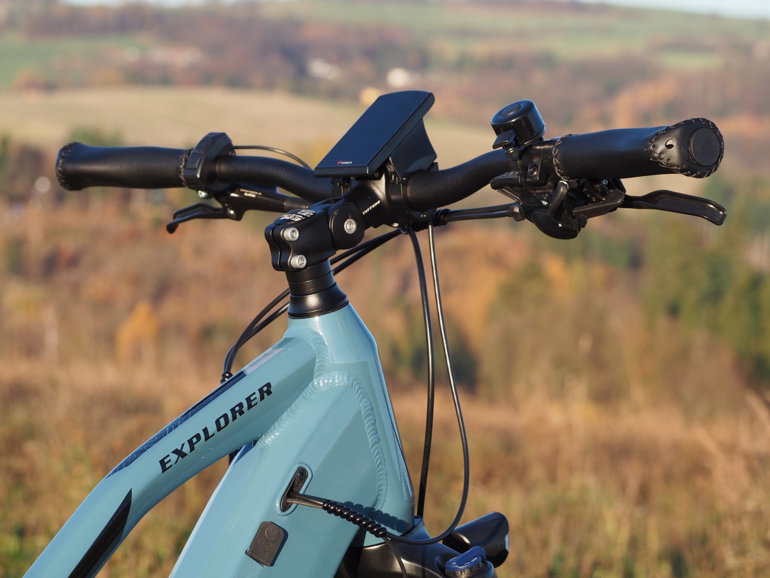 Osazení je logicky poplatné ceně a určení elektrokola, takže tady necílí na vyloženě terénní schopnosti, ale spíše každodenní využití ve městě a mimo něj, plus se lehčímu terénu samozřejmě nebrání. Pružinová vidlice je příjemně citlivá a lze ji uzamknout na korunce, což ale bude asi zbytečné, lepší je nechat ji pracovat. Devítková sada Altus má menší převodový rozsah kazety, ale funguje spolehlivě, stejně jako shimanovské brzdy MT200. Jemnější vzorek plášťů je příjemný jak na silnici, tak polní cestě a na suchém podkladu i v lese, ale bláto už jim není moc po chuti, naopak blatníky si svojí šířkou a tuhostí poradí i s kalužemi nebo blátem a na rozbitém podkladu nerachotí ani zbytečně nevibrují. Komfortní sedlo doplňují pohodlné ergonomické gripy se stylovým obšitím a příjemně dozadu zahnutá řídítka se stavitelným představcem. Jen se pozastavím nad celkovým posedem, který je s představcem nastaveným více vodorovně lehce natažený a usadí uživatelku s rukama trochu víc vpředu. Tady doporučujeme nastavit představec pohodlně nahoru, zkrátit tak posed a adekvátně tomu naklopit sedlo. Více vzpřímený posed je o úplně jiném pohodlí a z Exploreru se rázem stane výrazně komfortní společník. Příjemná ovladatelnost, točivý předek a nízké těžiště z něj pak společně s pohodlným posedem udělají ideální elektrokolo pro pohodlné každodenní využití či delší výlety, protože kapacita baterie a nízká spotřeba k tomu vyloženě vybízí.